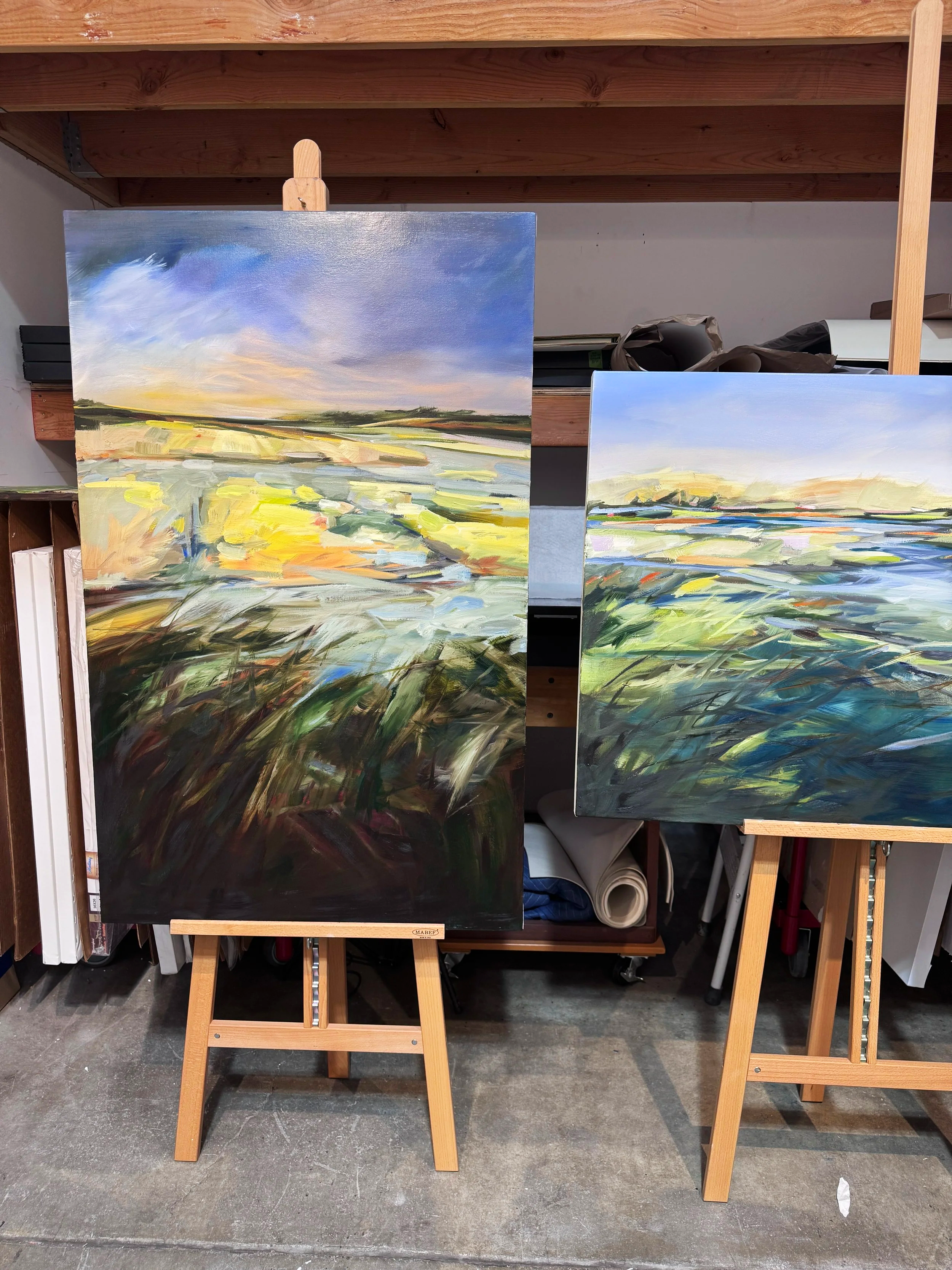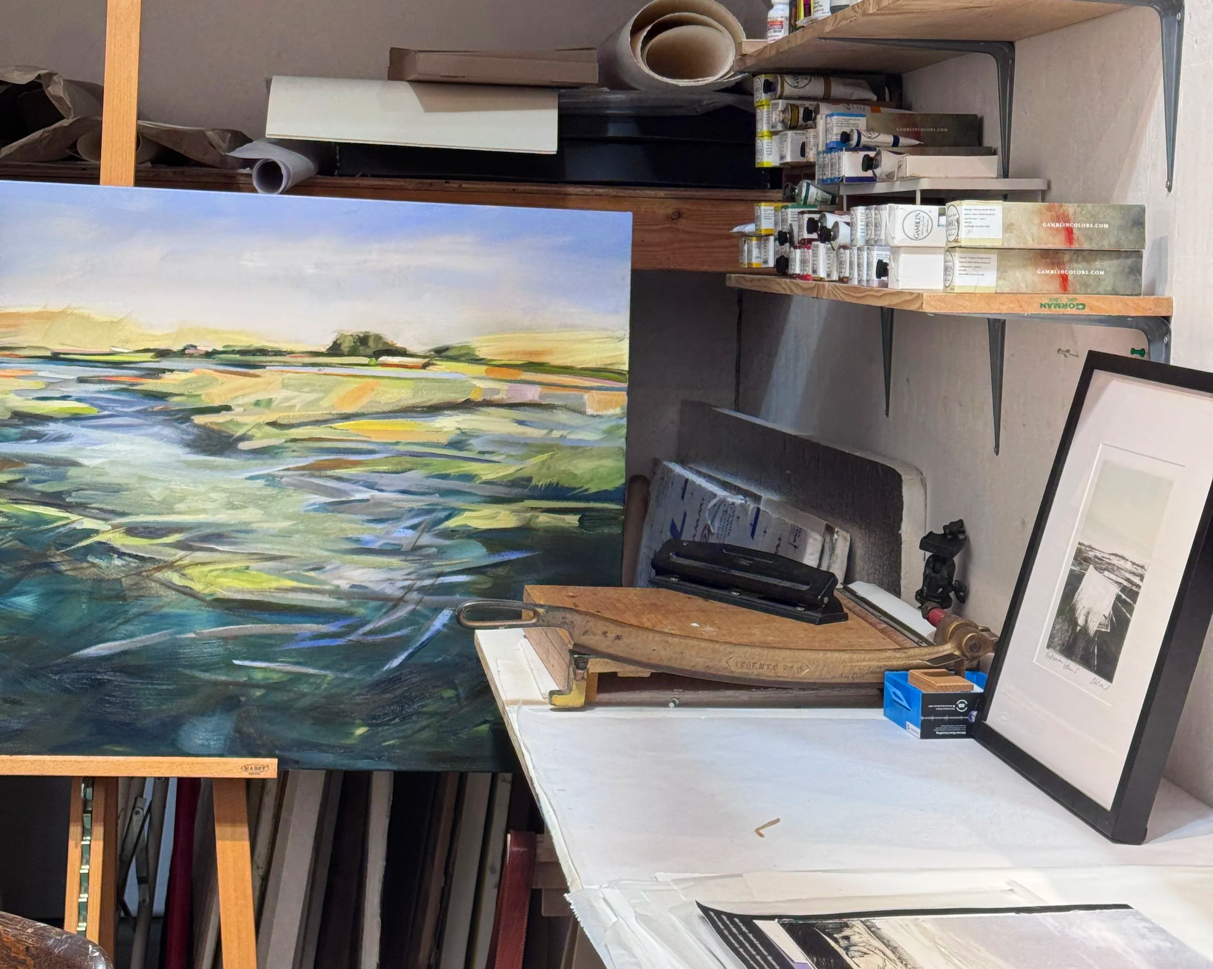 From her landscape paintings with broad brushstrokes and large swaths of color to her seemingly fragile charcoal nests, Kris’s work is clearly informed by her surroundings and sense of place. During our visit, she shared a newer collection of monotypes. She explains her print process is about edges, where water begins and where it stops. “The tipping points between when something is coming together and when it is coming apart.” She responds to the ebb and flow of tidal sloughs and to landscapes more by how they make her feel rather than strictly what they look like, “environmental art that doesn’t hit you over the head.” Making the move from WA to CA, Kris wondered how she could paint in a place when she did not yet know its stories. As she learned about Petaluma, its rhythms and its seasons, things got easier. “I was painting to figure out where I had landed.”